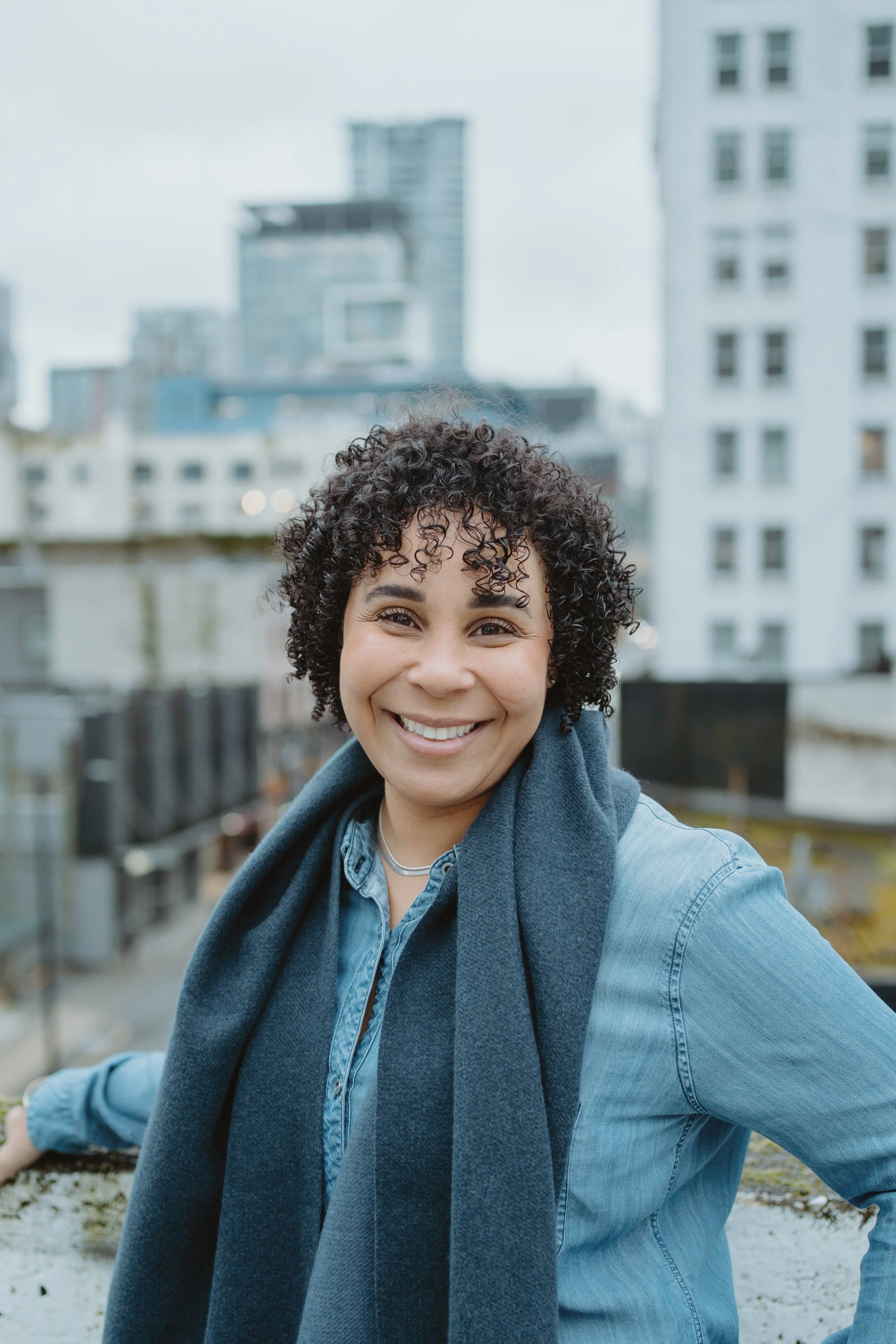 A smiling woman with short curly hair wearing a denim shirt and a dark jacket draped over her shoulders stands on a rooftop with a cityscape background.